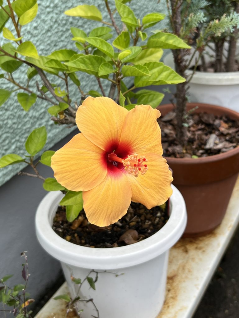 夏の象徴ともいえるハイビスカスは、猛暑のときも私たちの目を楽しませてくれましたが、季節外れの10月下旬でも幾分オレンジ系の黄色で元気に咲いてくれました。